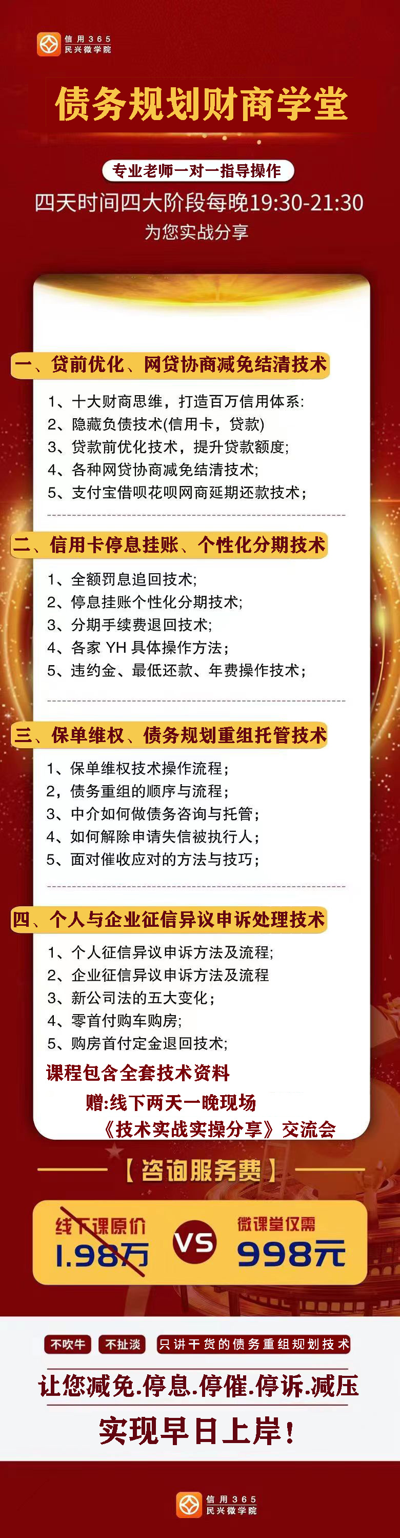 技术内容包括停息挂账、罚息追回、协商延期分期、免催收、退息退保、征信修复、规范用卡、保单维权、各种网贷免息结清、被起诉如何正确面对、债务重组与托管、购房定金退回等全套技术,并配备全套技术资料,技术加资料全国统一价998 元,开通会员可先学后付费,包教包会,专业老师一对一指导操作,现在报名送全套实操技术资料,报名请添加微信【备注学技术】